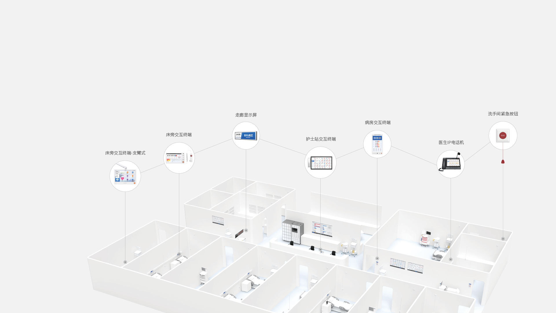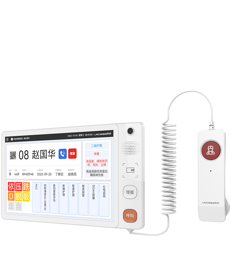 Lachesis bedside information interactive system includes nurse station terminal, ward interactive terminal, ward doorway interactive terminal and other hardware and system software, and displays information on multiple scenarios (e.g., ward bed head, ward door, nurse station) in real time and synchronously. In this way, patients and nurses can communicate in a timely manner to ensure medical safety. The system provides patients and their families with one-touch emergency call, real-time query, intelligent reminder and other functions to improve patients’ satisfaction.